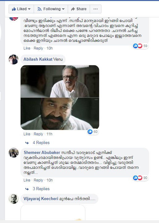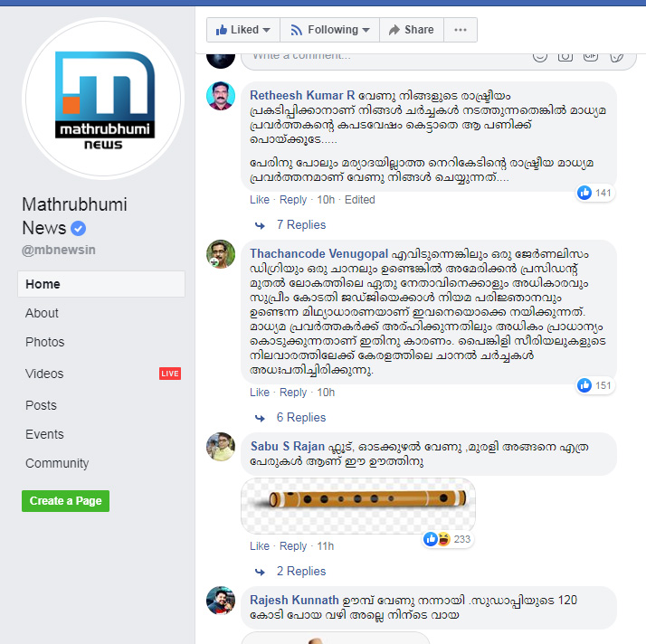 ഇടത് സഹയാത്രികനായ വേണു സിപിഎമ്മിന് വേണ്ടി കുഴലൂത്തു നടത്തുകയാണ്. ഇത്തരം ചര്ച്ചയില് നിന്ന് തന്റെ പ്രതിഷേധം അറിയിച്ച് ഇറങ്ങി പോയ സന്ദീപ് വാര്യര് ചുണക്കുട്ടിയാണ്. മാതൃഭൂമി ചര്ച്ചകളില് ബിജെപി നേതാക്കളാരും പങ്കെടുക്കരുത് തുടങ്ങിയ കമന്റുകളും പേജില് നിറയുന്നുണ്ട്.