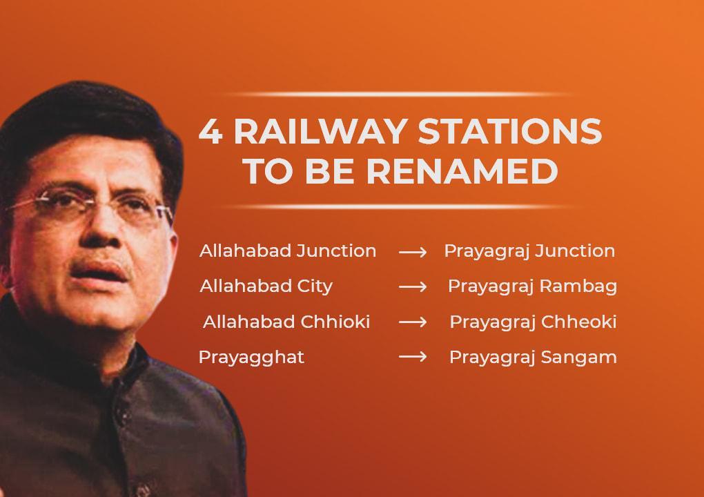 അലഹാബാദ് ചിയോക്കി റെയിൽവേ സ്റ്റേഷൻ, പ്രയാഗ് രാജ് ചിയോക്കി എന്നും, പ്രയാഗ്ഘാട്ട് റെയിൽവേ സ്റ്റേഷന്റെ പേര് പ്രയാഗ് രാജ് സംഗം എന്നുമാക്കി മാറ്റിയിട്ടുണ്ട്. കേന്ദ്ര റെയിൽവേ മന്ത്രി പിയൂഷ് ഗോയലാണ് ഈ തീരുമാനം മാധ്യമങ്ങളെ അറിയിച്ചത്.