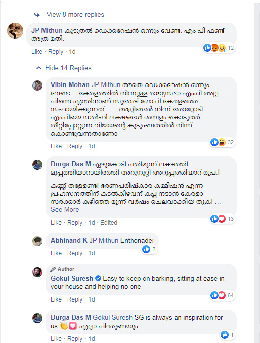 കുടുതല് ഡെക്കറേഷന് വേണ്ട എം.പി ഫണ്ട് അത്രമതി എന്ന കമന്റിട്ടയാള്ക്ക് ആരെയും സഹായിക്കാതെ വീട്ടിലിരുന്ന് കുരയ്ക്കാന് എളുപ്പമാണ് എന്നാണ് ഗോകുല് നല്കുന്ന മറുപടി.