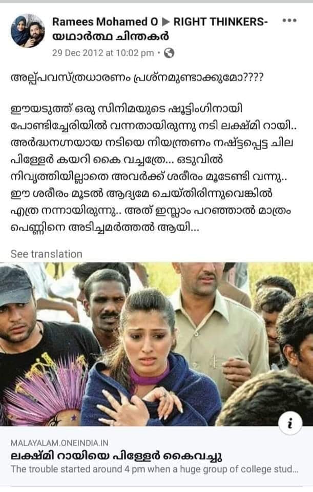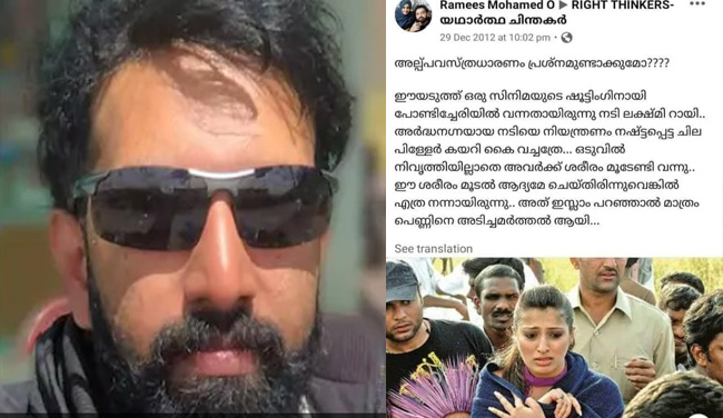 നടി ലഷ്മി റായിയെ പൊതു മധ്യത്തില് വച്ച് അപമാനിച്ച സംഭവത്തില് റമീസ് മുഹമ്മദ് ഇട്ട സ്ത്രീ വിരുദ്ധ പോസ്റ്റാണ് ഇതിലൊന്ന്. ലഷ്മി റായിയുടെ അര്ദ്ധ നഗ്ന ശരീരം കണ്ട് നിയന്ത്രണം നഷ്ടപ്പെട്ട ചിലര് കയറി പിടിച്ചെന്നും, ശരീരം മൂടിയിരുന്നെങ്കില് ഇത് ഉണ്ടാവില്ല എന്നുമായിരുന്നു റമീസിന്റെ നിലപാട്. ഇത് പറഞ്ഞാല് ഇസ്ലാം പെണ്ണിനെ അടിച്ചമര്ത്തല് ആയെന്നും ഇയാള് പറയുന്നു.