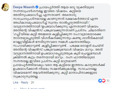 പ്രായപൂര്ത്തി ആയ ഒരു വ്യക്തിയുടെ നഗ്നതാപ്രദര്ശനമല്ല ഇവിടെ വിഷയം. കുട്ടിയെ അതിനുപയോഗിച്ചു എന്നതാണ്. അതൊരു സദാചാരപ്രശ്നമായല്ല കാണുന്നത്.രക്ഷാകര്ത്താവ് എന്ന അധികാരമുപയോഗിച്ച് സ്വന്തം താല്പ്പര്യത്തിനായി / വരുമാനത്തിനായി /ഉപയോഗിക്കുന്നു എന്നതാണ് വിഷയം. അതിന്റെ വിഷ്വല്സ് പങ്കുവെക്കുന്നതാണ് പ്രശ്നം. ചിലരതിനെ ‘ഗപ്പി’യിലെ കുട്ടി അമ്മയെ കുളിപ്പിക്കുന്ന രംഗവുമായൊക്കെ താരതമ്യപ്പെടുത്തി വിശദീകരിക്കുന്നതും കണ്ടു.ശാരീരികമായി വെല്ലുവിളികള് നേരിടുന്നവരെ നമ്മള് പലതരത്തിലും സഹായിക്കാറുണ്ട്. കുളിപ്പിക്കാറുണ്ട്… പക്ഷേ ഒരാളത് ചെയ്ത് അതിന്റെ വിഷ്വല്സ് പങ്കുവെക്കുമ്പോള് വിഷയം മാറും. അത് വരുമാനത്തിനായി ഉപയോഗപ്പെടുത്തുക കൂടി ചെയ്യുമ്പോള് ക്രിമിനല് കുറ്റം തന്നെയായി മാറും.. രഹ്ന ഫാത്തിമയുടെ നഗ്നതയല്ല ഇവിടെ പ്രശ്നം.കുട്ടി മാത്രമാണ്. പ്രായപൂര്ത്തിയാകും വരെ ആ കുട്ടിയെ ഇത്തരം കാര്യങ്ങള്ക്ക് ഉപയോഗിക്കാന് നിയമം സമ്മതിക്കുകയില്ല. സദാചാരമല്ല വിഷയമെന്ന് ആവര്ത്തിക്കുന്നു..കുട്ടി മാതാപിതാക്കളുടെ സ്വകാര്യസ്വത്തല്ല .