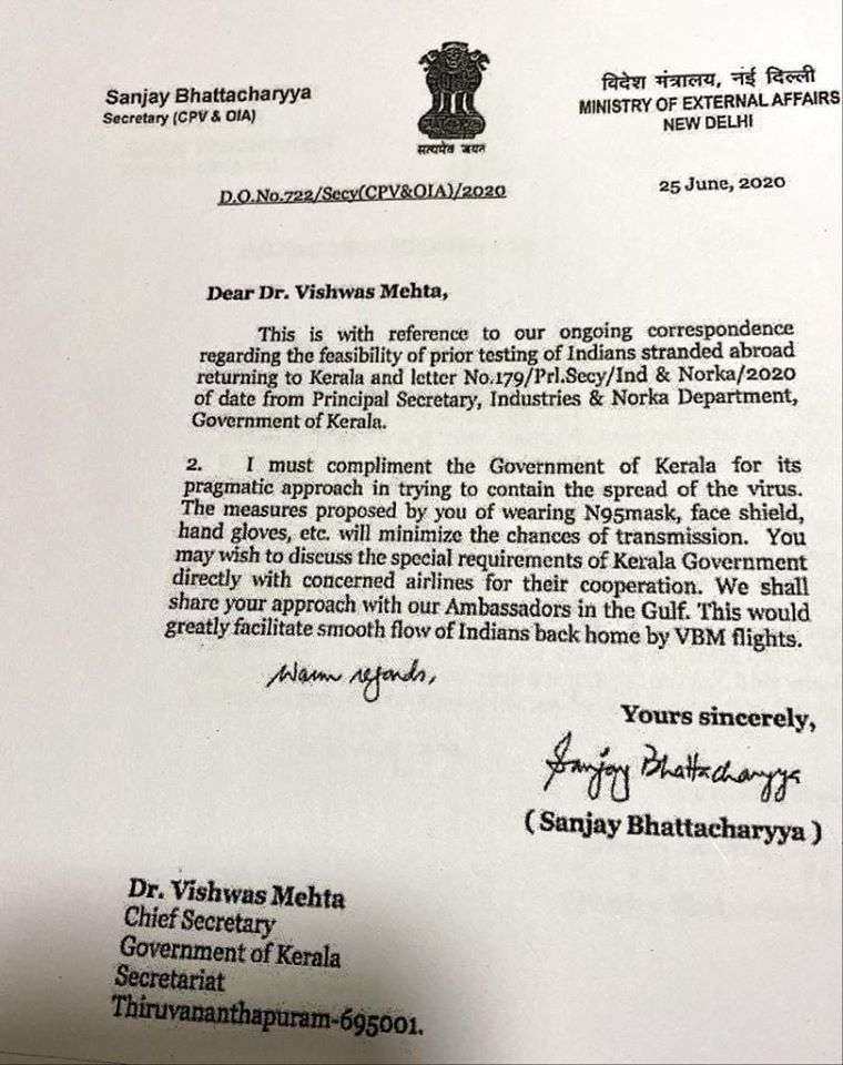 നേരത്തെ കൊവിഡ് നെഗറ്റീവ് സര്ട്ടിഫിക്കറ്റുള്ള പ്രവാസികളെ മാത്രമേ കേരളത്തിലെക്ക് പ്രവേശിപ്പിക്കു എന്ന് കേരളം നിലപാട് എടുത്തിരുന്നു. ഈയൊരു ആവശ്യത്തിന് അനുമതി വേണമെന്നാവശ്യപ്പെട്ട് കേന്ദ്രസര്ക്കാരിന് കത്തയക്കുകയും ചെയ്തു. എന്നാല് കേരളത്തിന്റെ ആവശ്യം പരിഗണിക്കാനാവില്ലെന്നും, ഒരു സംസ്ഥാനത്തിന് മാത്രമായി അത്തരമൊരു നിലപാട് സ്വീകരിക്കാനാവില്ലെന്നും കേന്ദ്രം മറുപടി നല്കി. ഇതിന് പിന്നാലെ എന്-95 മാസ്കും, മുഖാവരണവും,കയ്യുറയും ധരിച്ചവരെ പ്രവേശിപ്പിക്കാമെന്ന് കേരളം അറിയിച്ചു. ഈ നിലപാട് മാറ്റത്തെ അഭിനന്ദിക്കുന്നു എന്ന് കാണിച്ച് സഞ്ജയ് ഭട്ടാചാര്യ അയച്ച കത്താണ് കേരളത്തെ കേന്ദ്രം അഭിനന്ദിച്ചുവെന്ന് കാണിച്ച് മുഖ്യമന്ത്രിയുടെ ഓഫിസ് വിതരണം ചെയ്തത്.