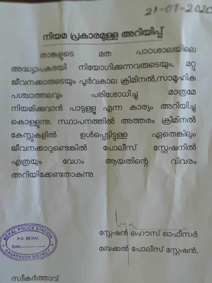 മദ്ര അധ്യാപകരെ നിയമിക്കുമ്പോള് ക്രിമിനല് പശ്ചാത്തലം പരിശോധിക്കണമെന്നാവശ്യപ്പെട്ട് കാസര്ഗോഡ് ജില്ലയിലെ പൊലീസ് സ്റ്റേഷനുകളില് നിന്ന് മഹല്ല് കമ്മിറ്റികള്ക്ക് നിര്ദേശം നല്കിയതായ വാര്ത്ത കാസര്കോഡ് ജില്ലാ പൊലീസ് മേധാവി ഡി ശില്പ്പയും നിഷേധിച്ചിട്ടില്ല.