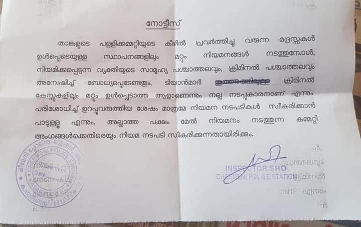 നിലവില് കേസുകളുള്ളവരുടെ വിവരങ്ങള് അറിയിക്കാനും ആവശ്യപ്പെട്ടിട്ടുണ്ട്. ഇക്കാര്യം പാലിക്കാതെ നിയമനം നടത്തിയാല് പളളിക്കമ്മറ്റി അംഗങ്ങള്ക്കെതിരേ നിയമ നടപടി സ്വീകരിക്കുമെന്നും നോട്ടിസില് പറയുന്നു. ചീമേനി, ബേക്കല് പോലിസ് സ്റ്റേഷന് ഹൗസ് ഓഫിസര്മാരാണ് നോട്ടിസ് പുറപ്പെടുവിച്ചിട്ടുള്ളത്.