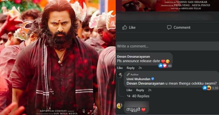 ഉണ്ണിയുടെ പോസ്റ്ററിന് താഴെ ആവേശത്തോടെയാണ് ആരാധകരുടെ പ്രതികരണം. ഇനിയും കാത്തിരിക്കാനാകില്ല റിലീസ് തീയതി പ്രഖ്യാപിക്കൂവെന്നാണ് അധികം പേരും കുറിച്ചത്. ഇതിലൊരു കമന്റിന് ഉണ്ണി നൽകിയ മറുപടിയും വൈറലായി. ദയവായി റിലീസ് തീയതി പ്രഖ്യാപിക്കൂവെന്ന ആരാധകന്റെ കമന്റിനാണ് യൂ മീൻ തേങ്ങ ഉടയ്ക്ക് സ്വാമീ എന്ന് ഉണ്ണിയുടെ മറുപടി എത്തിയത്. അതു തന്നെയാണ് ഉദ്ദേശിച്ചതെന്ന് പറഞ്ഞ് നിരവധി പേർ ഇതിന് മറുപടിയും നൽകി.