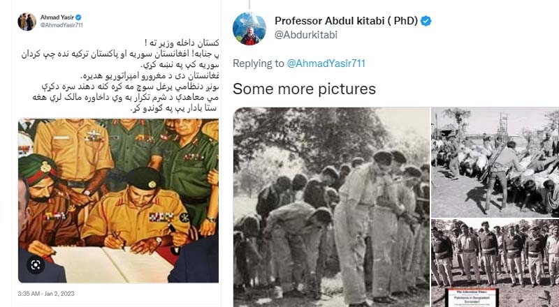 “പ്രിയപ്പെട്ട പാകിസ്ഥാൻ ആഭ്യന്തരമന്ത്രി, ബഹുമാനപ്പെട്ട സാർ, സിറിയയിലെ കുർദുകളെ തുർക്കി ആക്രമിച്ച പോലെ ഞങ്ങളുടെ നേർക്ക് തിരിഞ്ഞു കളയാം എന്ന് കരുതരുത്. ഇത് അഫ്ഗാനിസ്ഥാനാണ്. പല മഹാസാമ്രാജ്യങ്ങളുടെയും ശവപ്പറമ്പാണിവിടം. താലിബാനെതിരെ സൈനിക ആക്രമണം നടത്താമെന്ന് നിങ്ങൾ കരുതുന്നുണ്ടെങ്കിൽ 1971ൽ ഇന്ത്യയോട് യുദ്ധത്തിൽ തോറ്റ ശേഷം നാണം കെട്ട് സന്ധി ചെയ്യേണ്ടി വന്നതുപോലെ വരും എന്ന് ഓർത്തോളൂ” അഹമ്മദ് യാസിർ ട്വീറ്റ് ചെയ്തു. ട്വീറ്റിനോടൊപ്പം ഇന്ത്യൻ ആർമിയുടെ കിഴക്കൻ കമാൻ്റിൻ്റെ കമാൻഡറായ ജനറൽ ജഗ്ജിത് സിംഗ് അറോറയുടെ മുന്നിൽ പരാജയ സന്ധി ഒപ്പുവയ്ക്കുന്ന പാകിസ്ഥാൻ ജനറൽ അമീർ അബ്ദുള്ള ഖാൻ നിയാസിയുടെ ചിത്രവും അഹമ്മദ് യാസിർ പങ്കുവെച്ചിട്ടുണ്ട്.