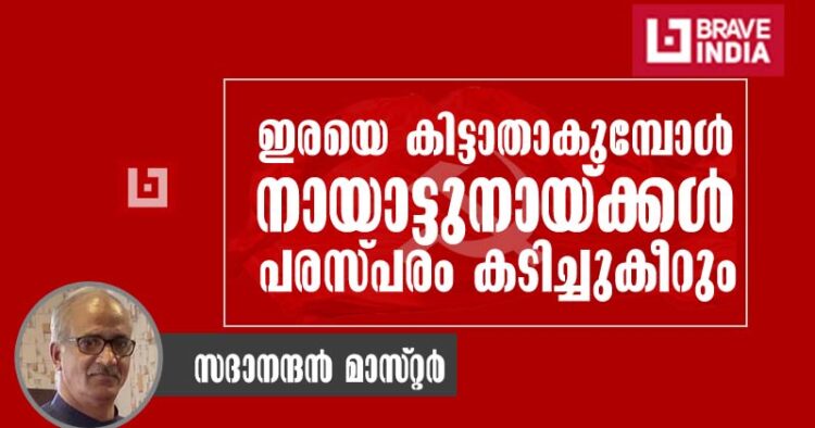 ഇരയെ കിട്ടാതാകുമ്പോൾ നായാട്ടുനായ്ക്കൾ പരസ്പരം കടിച്ചുകീറുന്ന ശൈലിയാണ് ഇപ്പോൾ സിപിഎമ്മുകാർക്കുള്ളത് എന്ന് ബിജെപി സംസ്ഥാന വൈസ് പ്രസിഡന്റ് സദാനന്ദൻ മാസ്റ്റർ. ആകാശ് തില്ലങ്കേരിമാരും അർജുൻ ആയങ്കിമാരും ഇനിയും രംഗത്തുവരും. കാരണം, മനുഷ്യ ബന്ധങ്ങൾക്കും സമൂഹത്തിനും മാർക്സിസ്റ്റുകൾ ഏൽപ്പിച്ച ക്ഷതം ചെറുതല്ലെന്നും അതിന്റെ പ്രത്യാഘാതം അവരെ തിരിഞ്ഞു കൊത്തുമെന്നും അദ്ദേഹം വ്യക്തമാക്കി.