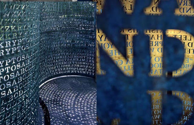 ജിം സാന്ബോണിന്റെ ക്രിപ്റ്റോസ് എന്ന ശില്പ്പം വിര്ജീനിയയിലെ സിഐഎ ക്യാംപസില് ആണുള്ളത്. കോഡ് ഭാഷയിലുള്ള നാല് വ്യത്യസ്ത ഖണ്ഡികകള് ആ ശില്പ്പത്തിലുണ്ട്. എന്നാല് അതില് മൂന്നെണ്ണമേ ഇതുവരെ വ്യാഖ്യാനിക്കപ്പെട്ടിട്ടുള്ളു. ഒരു ഖണ്ഡിക ശില്പ്പിയുടെ തന്നെ കവിതയിലെ ഒരു വരിയാണ്. മറ്റൊരെണ്ണം കുഴിച്ചുമൂടപ്പെട്ട എന്തിന്റെയോ സ്ഥലവിവരണമാണ്. മൂന്നാമത്തേത്, ടുട്ടാന്കാമന് രാജാവിന്റെ ശവകുടീരം കണ്ടെത്തിയ ആര്ക്കിയോളജിസ്റ്റായ ഹൊവാര്ഡ് ക്രേറ്ററിന്റെ വാക്കുകളാണ്. നാലാമത്തെ ഖണ്ഡിക ഇപ്പോഴും അജ്ഞാതമാണ്.