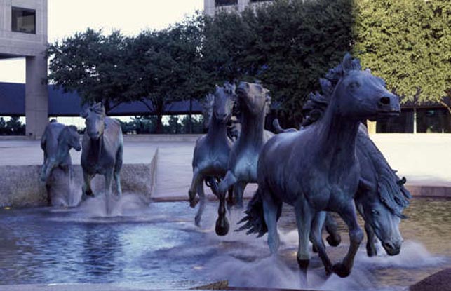 വെള്ളത്തിലൂടെ കുതിക്കുന്ന കാട്ടുകുതിരകളുടെ സുന്ദരശില്പ്പമാണ് റോബര്ട്ട് ഗ്ലെന്നിന്റെ കരവിരുതില് പിറന്ന ‘ലാസ് കോളിന്സിലെ കാട്ടുകുതിരകള്’. ടെക്സസിലെ കാട്ടുകുതിരകളാണ് ഈ ശില്പ്പത്തിലുള്ളത്. ടെക്സസിന്റെ പടിഞ്ഞാറന് മേഖലയിലുള്ള മെരുങ്ങാന് കൂട്ടാക്കാത്ത ഈ കുതിരകളുടെ ചരിത്രം വിശദമായി പഠിച്ചാണ് ഗ്ലെന് ഈ ശില്പ്പം നിര്മ്മിക്കാന് ആരംഭിച്ചത്. തെക്കന് സ്പെയിനുമായുള്ള അവയുടെ ബന്ധം മുതല്ക്കുള്ള കാര്യം ഗ്ലെന് പഠനവിധേയമാക്കിയിരുന്നു. എട്ടുവര്ഷമാണ് ശില്പ്പനിര്മ്മാണത്തിനും അതിനെ കുറിച്ച് പഠിക്കുന്നതിനുമായി അദ്ദേഹം മാറ്റിവെച്ചത്.