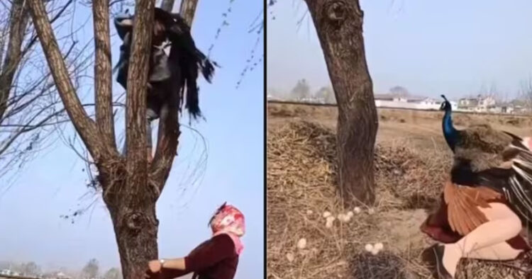 മയില് കൂട്ടിനടുത്ത് ഇല്ലാത്ത തക്കം നോക്കി മുട്ട അടിച്ചുമാറ്റാന് എത്തിയ രണ്ട് സ്ത്രീകളില് ഒരാള് മരത്തിന് മുകളിലേക്ക് കയറുകയായിരുന്നു. എന്നാല് എന്തോ പന്തികേട് മണത്ത് ഉടനടി അമ്മ മയില് സ്ഥലത്ത് ഹാജരാകുകയും മരത്തില് കയറിയ സ്ത്രീയെ കൊത്തി പരിക്കേല്പ്പിച്ച് മുട്ടകള് സംരക്ഷിക്കുകയും ആയിരുന്നു.