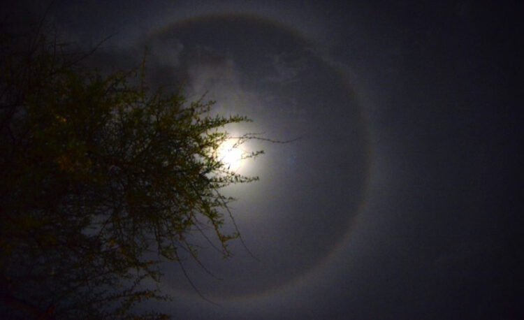 അന്തരീക്ഷത്തിന്റെ ഉയര്ന്ന പാളികളിലെ ഐസ് പരലുകളില് തട്ടി പ്രകാശം അപവര്ത്തനം സംഭവിക്കുമ്പോഴാണ് ലൂണാർ ഹാലോ ദൃശ്യമാവുന്നത്. “മൂൺ ഹാലോ”, “മൂൺ റിംഗ്” അല്ലെങ്കിൽ “22° ഹാലോ” എന്നിങ്ങനെ വിവിധ പേരുകളിൽ ഈ അന്തരീക്ഷ പ്രതിഭാസം അറിയപ്പെടാറുണ്ട്. കൊടുങ്കാറ്റുകൾ സംഭവിക്കുന്നതിന് മുമ്പ് കാണുന്ന അടയാളങ്ങളായും ചിലയിടങ്ങളിൽ ലൂണാർ ഹാലോ അറിയപ്പെടുന്നു.