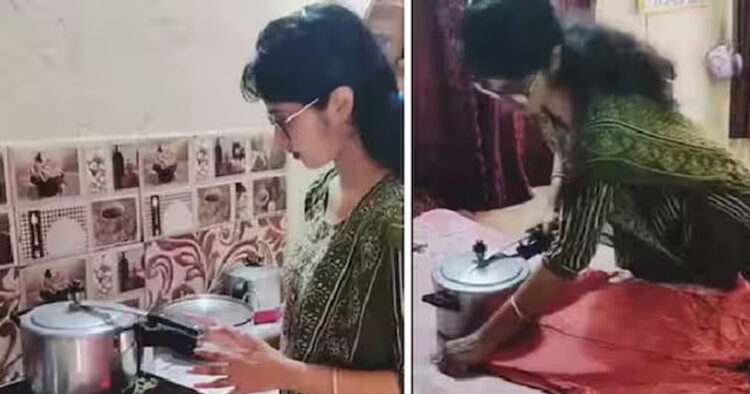പ്രഷർ കുക്കർ ഉപയോഗിച്ച് ഷർട്ട് ഇസ്തിരിയിടുന്ന യുവതിയുടെ വീഡിയോ സമൂഹമാദ്ധ്യമങ്ങളിൽ വൈറലാകുകയാണ്. ഇൻഡക്ഷൻ കുക്കറിൽ പ്രഷർ കുക്കർ വച്ച് ചൂടാക്കിയതിന് ശേഷം അതെടുത്താണ് അവർ ഷർട്ട് തേയ്ക്കുന്നത്. എന്തായാലും ദോഷം പറയാൻ കഴിയില്ല. ഷർട്ടിന്റെ ചുളിവെല്ലാം പോകുന്നത് വീഡിയോയിൽ കാണാം.