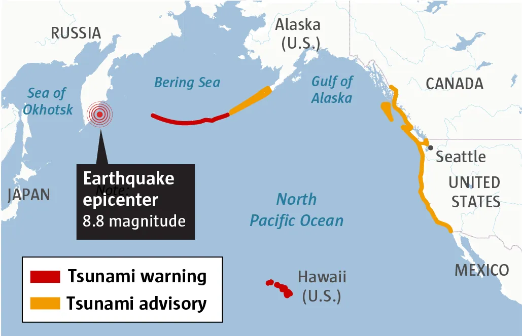 റഷ്യയുടെ കിഴക്കൻ തീരത്തുണ്ടായ 8.8 തീവ്രത രേഖപ്പെടുത്തിയ ഭൂകമ്പത്തെ തുടർന്നാണ് പസഫിക് മേഖലയിൽ സുനാമി ഭീഷണി ഉയർന്നിരിക്കുന്നത്. അലാസ്കയിലും ഹവായിയിലും ശക്തമായ തിരമാലകൾ ആഞ്ഞടിക്കുന്നുണ്ട്. ഹവായിയിൽ നാലടി വരെ ഉയരത്തിൽ തിരമാലകൾ കരയിലേക്ക് അടിച്ചുകയറി. ഹവായ് കൗണ്ടിയിൽ അടിയന്തര ഷെൽട്ടറുകൾ തുറന്നിട്ടുണ്ട്.