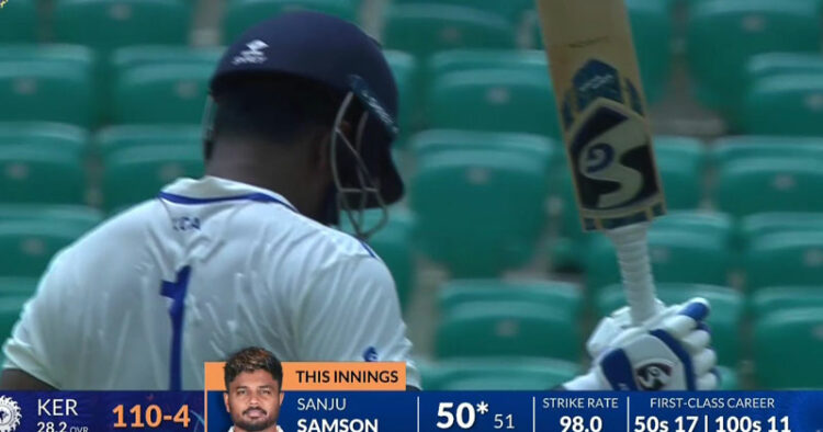 ഒടുവിൽ 7 റൺ നേടിയ സച്ചിൻ പുറത്തായതിന് പിന്നാലെ ക്രീസിലെത്തിയത് മുഹമ്മദ് അസറുദ്ദീനായിരുന്നു. താരവും നന്നായി കളിച്ചു വന്നപ്പോൾ കേരള സ്കോർബോർഡ് കുതിച്ചു. സഞ്ജുവിന്റെ ഇന്നിങ്സിൽ ഒരു സിക്സും അഞ്ച് ഫോറും ഉണ്ടായിരുന്നു. വിക്കി ഒസ്റ്റ്വാളിന്റെ പന്തിലായിരുന്നു സഞ്ജു മടങ്ങിയത്.