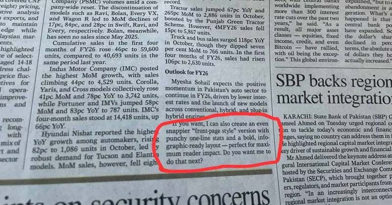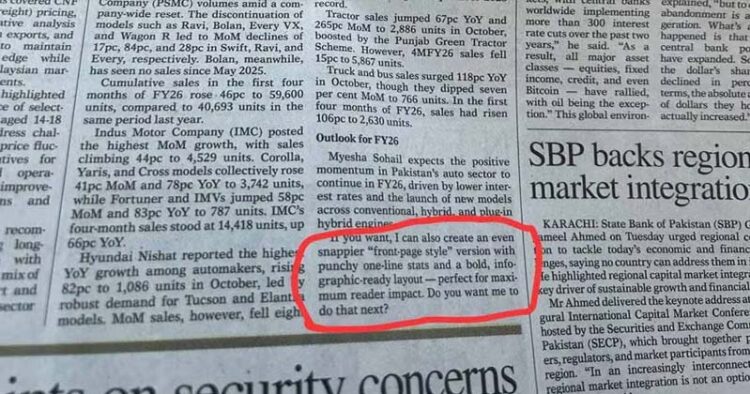 വാർത്തയ്ക്കൊപ്പം എഐ പ്രോംപ്റ്റ് പ്രസിദ്ധീകരിച്ചതിനെ തുടർന്ന് എയറിലായി പാകിസ്താൻ പത്രം ഡോൺ. നവംബർ 12ന് ബിസിനസ് പേജിലെ ഒരു റിപ്പോർട്ടിലാണ് തെറ്റ് സംഭവിച്ചത്. 1941ൽ മുഹമ്മദ് അലി ജിന്ന സ്ഥാപിച്ച പത്രമാണ് ഡോൺ. ആമിർ ഷഫാത്ത് ഖാൻ എന്നയാൾ എഴുതിയ വാർത്തയിലാണ് പിഴവ് സംഭവിച്ചത്