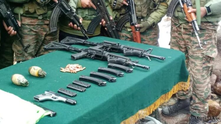 രണ്ട് എം4 സീരീസ് അസോൾട്ട് റൈഫിളുകൾ, രണ്ട് ചൈനീസ് പിസ്റ്റളുകൾ, ഗ്രനേഡുകൾ, വെടിയുണ്ടകൾ എന്നിവയാണ് സുരക്ഷാസേന കണ്ടെടുത്തിട്ടുള്ളത്. കൂടുതൽ ഒളിത്താവളങ്ങളോ ആയുധശേഖരങ്ങളോ ഉണ്ടോ എന്ന് കണ്ടെത്തുന്നതിനായി സമീപ പ്രദേശങ്ങളിൽ കൂടുതൽ തിരച്ചിൽ നടക്കുന്നുണ്ട്.