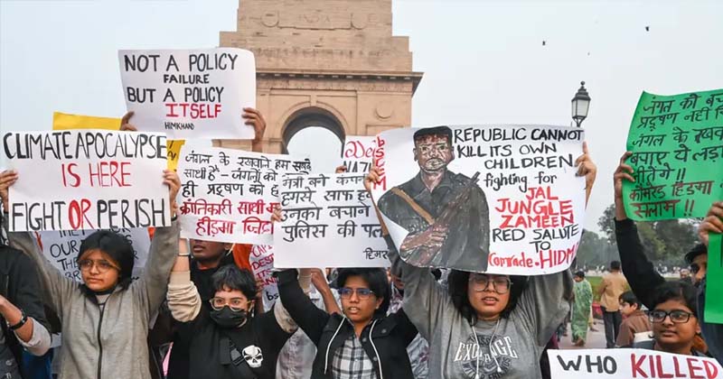ജെഎൻയുവിലും ഡൽഹി സർവകലാശാലയിലും പഠിക്കുന്ന വിദ്യാർത്ഥികളാണ് ഈ സമരത്തിൽ പ്രധാനമായും പങ്കെടുത്തത്. സമരത്തിൽ കമ്യൂണിസ്റ്റ് ഭീകരനേതാക്കൾക്ക് അനുകൂലമായി ഇവർ മുദ്രാവാക്യം വിളിച്ചു.പോലീസ് പ്രതിഷേധക്കാരെ പിരിച്ചുവിടുന്നത് തുടരുന്നതിനിടെ, ഒരു കൂട്ടം ആളുകൾ ‘മാദ്വി ഹിദ്മ അമർ രഹേ’ (മാദ്വി ഹിദ്മ നീണാൾ വാഴട്ടെ) എന്ന് മുദ്രാവാക്യം വിളിച്ചു. ‘ബിർസ മുണ്ട മുതൽ മാദ്വി ഹിദ്മ വരെ, നമ്മുടെ വനങ്ങളുടെയും പരിസ്ഥിതിയുടെയും പോരാട്ടം തുടരും’ എന്ന് എഴുതിയ പോസ്റ്റർ ഒരാൾ പിടിച്ചിരിക്കുന്നതും സമരത്തിന്റെ ദൃശ്യങ്ങളിലുണ്ട്.