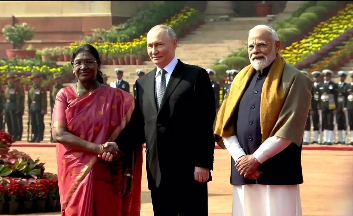 ന്യൂഡൽഹി : ഇന്ത്യ-റഷ്യ വാർഷിക ഉച്ചകോടിയിൽ പങ്കെടുക്കുന്നതിനായി ന്യൂഡൽഹിയിൽ എത്തിയ റഷ്യൻ പ്രസിഡണ്ട് വ്ളാഡിമിർ പുടിന് രാഷ്ട്രപതി ഭവനിൽ ആചാരപരമായ സ്വീകരണം നൽകി. മൂന്ന് ഇന്ത്യൻ സേനകളും ചേർന്ന് അദ്ദേഹത്തിന് ഗാർഡ് ഓഫ് ഓണർ നൽകി. പ്രധാനമന്ത്രി നരേന്ദ്ര മോദിയും പ്രസിഡന്റ് ദ്രൗപതി മുർമുവും ഉൾപ്പെടെ നിരവധി മുതിർന്ന വിശിഷ്ട വ്യക്തികളും നേതാക്കളും ചടങ്ങിൽ സന്നിഹിതരായിരുന്നു.
