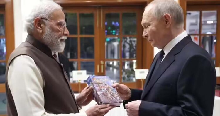 രണ്ട് ദിവസത്തെ സന്ദര്ശനത്തിനായി ഇന്ത്യയിലെത്തിയ റഷ്യന് പ്രസിഡന്റ് വ്ലാഡിമിർ പുടിന് ഭഗവത് ഗീതയുടെ കോപ്പി സമ്മാനിച്ച് പ്രധാനമന്ത്രി നരേന്ദ്രമോദി. റഷ്യൻ ഭാഷയിലുള്ള ഭഗവദ്ഗീതയുടെ കോപ്പിയാണ് സമ്മാനിച്ചത്. ഭഗവദ്ഗീത ലോകമെമ്പാടുമുള്ള ദശലക്ഷക്കണക്കിന് ആളുകൾക്ക് പ്രചോദനം നൽകുന്നുവെന്ന് പ്രധാനമന്ത്രി പറഞ്ഞു.