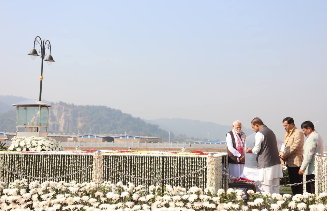 അസം പ്രസ്ഥാനത്തിന്റെ ആദ്യ രക്തസാക്ഷി ഖാർഗേശ്വർ താലൂക്ക്ദാറിന്റെ പ്രതിമയിൽ മാല ചാർത്തിക്കൊണ്ട് പ്രധാനമന്ത്രി ആദരവർപ്പിച്ചു. അടുത്തിടെയാണ് രക്തസാക്ഷികളെ ആദരിക്കുന്നതിനായി അസമിൽ സ്വാഹിദ് സ്മാരക ക്ഷേത്രം നിർമ്മാണം പൂർത്തിയായത്. 170 കോടി ചെലവിൽ നിർമ്മിച്ച ഈ സ്മാരകം ഗാലറികളിലൂടെയും പ്രദർശനങ്ങളിലൂടെയും പ്രക്ഷോഭത്തിന്റെ ചരിത്രം പ്രദർശിപ്പിക്കുന്നു. ഈ മാസം ആദ്യം സ്മാരകം ഉദ്ഘാടനം ചെയ്യപ്പെട്ടു. രക്തസാക്ഷികളോടുള്ള ആദരസൂചകമായി ഒരിക്കലും അണയാത്ത ഒരു കെടാവിളക്ക് ഈ സ്മാരകത്തിൽ ഉണ്ട്.