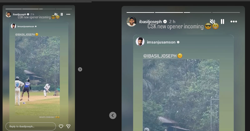 എന്തായാലും ക്രിക്കറ്റ് മൈതാനത്ത് പടുകൂറ്റൻ സിക്സ് അടിക്കുന്ന ബേസിലിന്റെ വീഡിയോ ഇൻസ്റ്റാഗ്രാം സ്റ്റോറിയിലൂടെ പങ്കുവെച്ച സഞ്ജു ‘ എന്താണ് ഒരുങ്ങുന്നത്’ എന്ന അടിക്കുറിപ്പും ആ സ്റ്റോറിക്ക് നൽകി. പിന്നാലെ ആ വീഡിയോ മെൻഷൻ ചെയ്ത് ബേസിൽ കുറിച്ച അടിക്കുറിപ്പാണ് കൂടുതൽ രസകരം. ചെന്നൈ സൂപ്പർ കിങ്സിന്റെ അടുത്ത ഓപ്പണർ താൻ ആണെന്ന് അതിൽ ബേസിൽ കുറിക്കുകയും ചെയ്തു.