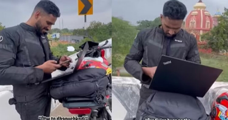അവധിക്കാലം ആഘോഷിക്കാൻ ബൈക്കുമെടുത്ത് ഇറങ്ങിയതാണ് അവർ. ചുറ്റും മനോഹരമായ കാഴ്ചകൾ, വീശിയടിക്കുന്ന കടൽക്കാറ്റ്. എന്നാൽ ആ കാഴ്ചകളൊന്നും ആസ്വദിക്കാനാകാതെ, ബൈക്കിന് മുകളിൽ ലാപ്ടോപ്പ് വെച്ച് ടൈപ്പ് ചെയ്യുന്ന ഒരു യുവാവാണ് ഇപ്പോൾ ഇന്റർനെറ്റിലെ താരം.