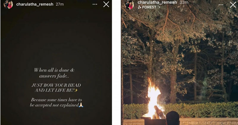 ” എല്ലാം കഴിഞ്ഞുപോകുകയും ഉത്തരങ്ങൾ ഇല്ലാതാകുകയും ചെയ്യുമ്പോൾ… തലകുനിച്ച് ജീവിതത്തെ അതിന്റെ വഴിക്ക് വിടുക! കാരണം ചില സമയങ്ങൾ അംഗീകരിക്കപ്പെടേണ്ടവയാണ്, വിശദീകരിക്കപ്പെടേണ്ടവയല്ല”. അവർ കുറിച്ചു.