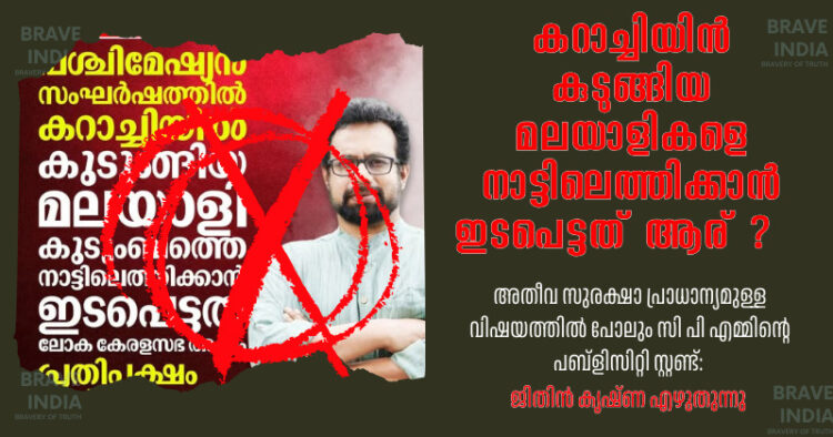 ഇതിനിടയിൽ നടന്ന ഏറ്റവും വലിയ വൃത്തികേട് എന്താണെന്ന് വെച്ചാൽ, ശത്രു രാജ്യത്ത് ഇന്ത്യൻ കുടുംബം കുടുങ്ങി കിടക്കുന്ന വാർത്ത വളരെ രഹസ്യാത്മകമായി കേന്ദ്ര വിദേശകാര്യ വകുപ്പിനെ അറിയിച്ച് സഹായത്തിന് വേണ്ടി കാത്തിരിക്കുമ്പോൾ … “കറാച്ചിയിൽ കുടുങ്ങി മലയാളി കുടുംബം, നോർക്ക ഇടപെടുന്നു” എന്ന് വാർത്ത നൽകി പബ്ലിസിറ്റി ഉണ്ടാക്കാൻ നോക്കിയവരോട് കുറച്ച് മണ്ണ് വാരി തിന്നൂടെ എന്നെ ചോദിക്കാനുള്ളു.. ആ വാർത്ത വന്നപ്പോൾ ആ കുടുംബം അനുഭവിച്ച ടെൻഷൻ അവർക്ക് മാത്രമേ അറിയൂ.. കാരണം US എംബസി പോലും ആക്രമിക്കുന്ന നിലയിലേക്ക് പാകിസ്ഥാനിൽ സാഹചര്യം വഷളായി നിൽക്കുന്ന സമയത്താണ് ഒരു ഇന്ത്യൻ കുടുംബം കറാച്ചിയിൽ എന്നത് ചെറുതല്ലാത്ത വാർത്ത ആയിരുന്നു എന്ന് ചിന്തിക്കാനുള്ള വിവേകം എങ്കിലും കാണിക്കണമായിരുന്നു.. എന്തായാലും PR വർക്ക് ഗംഭീരമായി നടക്കട്ടെ!