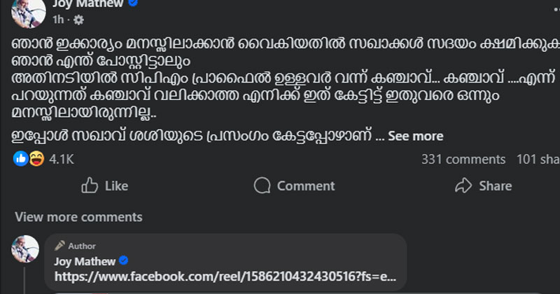 “ഞാൻ എന്ത് പോസ്റ്റിട്ടാലും അതിനടിയിൽ സിപിഎം പ്രൊഫൈൽ ഉള്ളവർ വന്ന് കഞ്ചാവ്… കഞ്ചാവ് എന്ന് പറയുന്നത് കഞ്ചാവ് വലിക്കാത്ത എനിക്ക് ഇതുവരെ മനസ്സിലായിരുന്നില്ല. ഇപ്പോൾ സഖാവ് ശശിയുടെ പ്രസംഗം കേട്ടപ്പോഴാണ് കാര്യം പിടികിട്ടിയത്,” ജോയ് മാത്യു കുറിച്ചു. വിപ്ലവം നടത്താൻ തങ്ങളിലേക്ക് കഞ്ചാവ് എത്തിക്കാൻ ആവശ്യപ്പെട്ട് നിലവിളിക്കുകയായിരുന്നു ഈ സൈബർ അടിമകളെന്ന് അദ്ദേഹം പരിഹസിച്ചു.