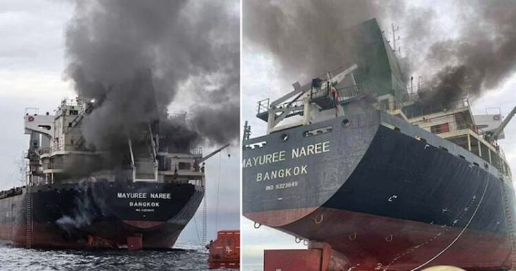 പശ്ചിമേഷ്യൻ സംഘർഷം പുതിയ തലത്തിലേക്ക്. യുഎഇയിൽ നിന്ന് ഗുജറാത്തിലെ കണ്ട്ല തുറമുഖത്തേക്ക് പുറപ്പെട്ട തായ്ലൻഡ് ചരക്കുകപ്പലിന് നേരെ ഹോർമുസ് കടലിടുക്കിൽ വെച്ച് ഇറാൻ ആക്രമണം നടത്തി. തായ്ലൻഡ് ഉടമസ്ഥതയിലുള്ള ‘മയൂരി നാരി’ (Mayuree Naree) എന്ന കപ്പലിന് നേരെയാണ് ബുധനാഴ്ച ആക്രമണമുണ്ടായത്. ആക്രമണത്തിന്റെ ഉത്തരവാദിത്തം ഇറാൻ ഏറ്റെടുത്തു. കപ്പലിന്റെ എൻജിൻ റൂമിലും മുകൾഭാഗത്തും അതിശക്തമായ തീപിടുത്തമുണ്ടായതായും കിലോമീറ്ററുകളോളം കറുത്ത പുക ഉയർന്നതായും തായ്ലൻഡ് റോയൽ നേവി പുറത്തുവിട്ട ദൃശ്യങ്ങൾ വ്യക്തമാക്കുന്നു.