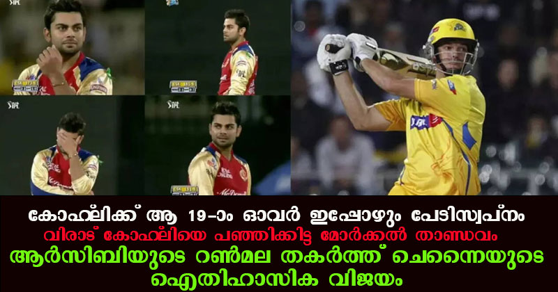 അവസാന 12 പന്തിൽ സിഎസ്കെയ്ക്ക് ജയിക്കാൻ വേണ്ടിയിരുന്നത് 43 റൺസായിരുന്നു. എന്നാൽ അവിടെ കളി ജയിക്കുമെന്ന അമിത ആത്മവിശ്വാസം ആർസിബിയെ ചതിച്ചു. ആർസിബി നായകൻ ഡാനിയൽ വെട്ടോറി പന്ത് വിരാട് കോഹ്ലിയെ ഏൽപ്പിച്ചു. സ്ട്രൈക്കിൽ ദക്ഷിണാഫ്രിക്കൻ പവർ ഹിറ്റർ ആൽബി മോർക്കൽ. പിന്നീട് ചെപ്പോക്ക് കണ്ടത് മോർക്കലിന്റെ സംഹാര താണ്ഡവമാണ്. 3 കൂറ്റൻ സിക്സറുകളും 2 ഫോറും അടക്കം കോഹ്ലിയുടെ ആ ഓവറിൽ നിന്ന് മോർക്കൽ അടിച്ചെടുത്തത് 28 റൺസ് (7 പന്തിൽ 28 റൺസ് നേടിയാണ് മോർക്കൽ പുറത്തായത്).