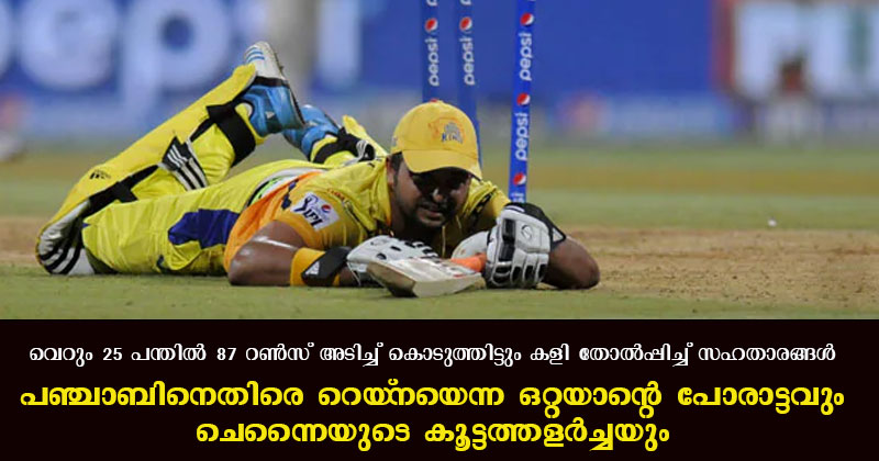 വെറും 25 പന്തുകൾ മാത്രം നേരിട്ട റെയ്ന 87 റൺസാണ് അടിച്ചുകൂട്ടിയത്. 348 എന്ന അവിശ്വസനീയമായ സ്ട്രൈക്ക് റേറ്റിലായിരുന്നു ആ ബാറ്റിംഗ് വിസ്മയം. റെയ്നയുടെ ഈ ഇന്നിംഗ്സിൽ 12 അതിമനോഹരമായ ഫോറുകളും 6 പടുകൂറ്റൻ സിക്സറുകളും ഉൾപ്പെട്ടിരുന്നു. പഞ്ചാബിന്റെ ലോകോത്തര ബൗളർമാർ പോലും റെയ്നയുടെ ബാറ്റിംഗ് ചൂടറിഞ്ഞു.