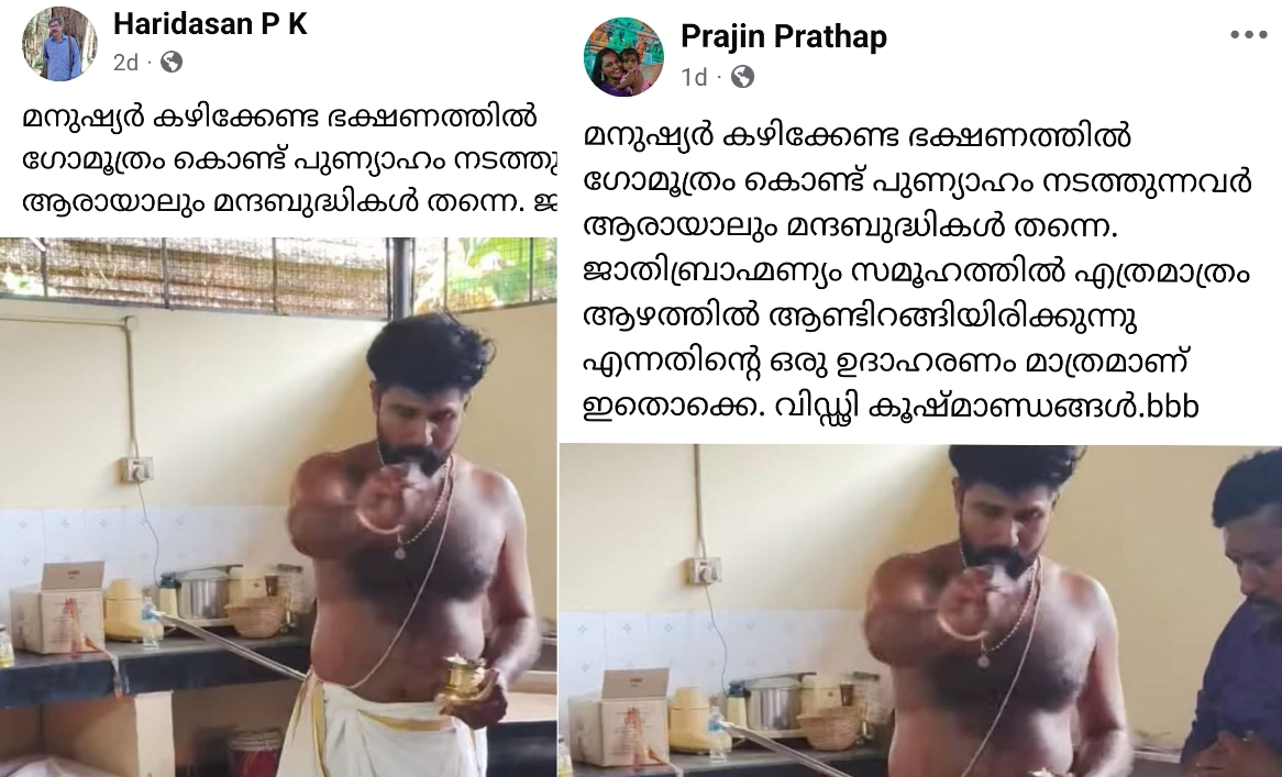 കോട്ടയം : ചങ്ങനാശ്ശേരിയിലെ തൃക്കൊടിത്താനം മഹാവിഷ്ണുക്ഷേത്രത്തിലെ നിവേദ്യത്തിനെതിരെ അധിക്ഷേപ പരാമർശവുമായി സിപിഐഎം സൈബർ പോരാളികൾ. ക്ഷേത്രത്തിലെ ഏറെ ഐതിഹ്യപ്രസിദ്ധമായ മാമ്പഴ പുളിശ്ശേരി നിവേദ്യത്തിൽ ഗോമൂത്രം തളിച്ചെന്ന് സമൂഹമാധ്യമങ്ങളിലൂടെ വ്യാപകമായി പ്രചരിപ്പിക്കുകയായിരുന്നു. ദേശവാസികൾ ഏറെ ഭക്തിയോടെ കാണുന്ന ഒരു ക്ഷേത്ര നിവേദ്യത്തിനെതിരെയാണ് സൈബർ പോരാളികളുടെ ഈ അധിക്ഷേപം.