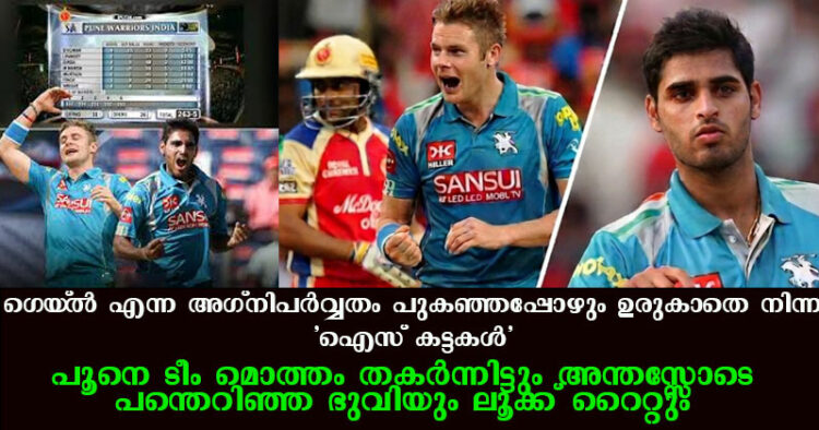 മൈതാനത്തിന്റെ നാലുപാടും സിക്സറുകൾ പറന്ന മത്സരത്തിൽ പൂനെയുടെ എല്ലാ ബൗളർമാരും ഗെയിലിന്റെ ബാറ്റിന്റെ ചൂടറിഞ്ഞു. എന്നാൽ, ആ റൺമഴയിലും തളരാതെ പന്തെറിഞ്ഞ രണ്ട് താരങ്ങൾ ശ്രദ്ധേയമായി. ഗെയിലിന്റെ സംഹാരതാണ്ഡവത്തിനിടയിലും 4 ഓവറിൽ വെറും 23 റൺസ് മാത്രമാണ് ഭുവി വിട്ടുനൊടുത്തത്. ആ ഇന്നിംഗ്സിലെ ഏറ്റവും മികച്ച ബൗളിംഗ് പ്രകടനമായിരുന്നു ഇത്.