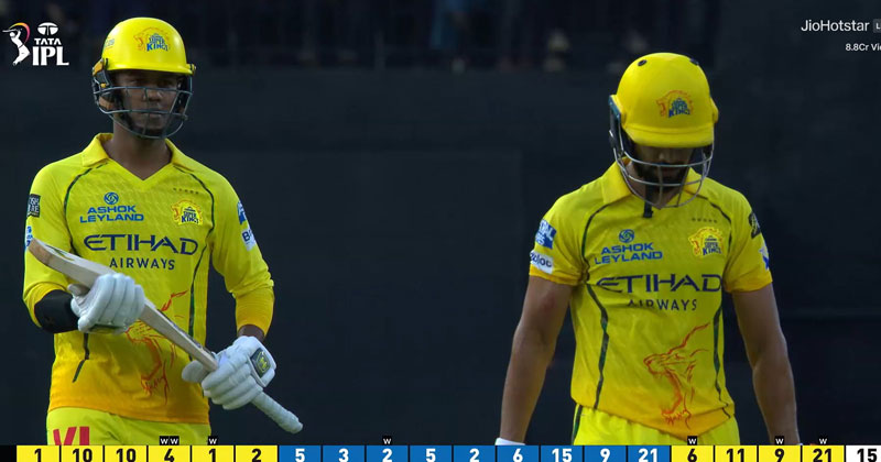 ഈ ഐപിഎൽ സീസണിലെ ഏറ്റവും മന്ദഗതിയിലുള്ള ടീം ഫിഫ്റ്റിയെന്ന നാണക്കേടാണ് ചെന്നൈ സ്വന്തമാക്കിയത്. സിഎസ്കെയുടെ ഐപിഎൽ ചരിത്രത്തിലെ രണ്ടാമത്തെ ഏറ്റവും വേഗത കുറഞ്ഞ 50 റൺസ് നേട്ടമാണിത്. 2011-ൽ ആർസിബിക്കെതിരെ 12.1 ഓവറിൽ 50 തികച്ചതാണ് ഇതിനുമുൻപുള്ള റെക്കോർഡ്. സൂപ്പർതാരം സഞ്ജു സാംസൺ 11 റൺസിന് പുറത്തായതോടെ ചെന്നൈയുടെ ബാറ്റിംഗ് വേഗത നിലയ്ക്കുകയായിരുന്നു. പണ്ട് സച്ചിൻ ഔട്ടായാൽ ഇന്ത്യൻ ടീം നേരിട്ടിരുന്ന അതേ അവസ്ഥയാണ് ചെന്നൈ ഇപ്പോൾ നേരിടുന്നത്.